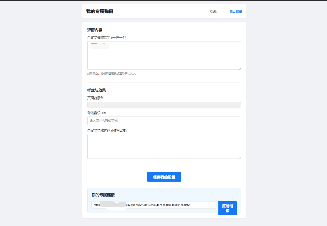 2、独立用户中心:不只是你自己能玩。这套源码带了完整的用户体系,别人可以自由注册、登录,然后在自己的面板里,自定义只属于他自己的弹窗页面,每个用户都能生成一条独一无二的分享链接。