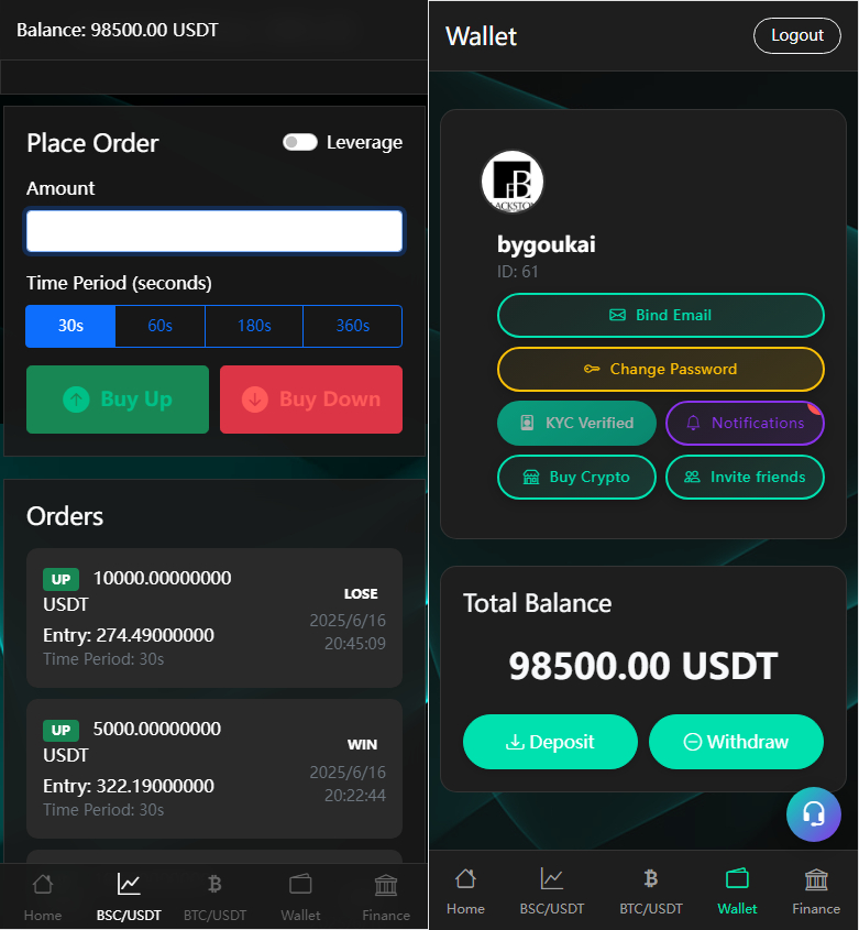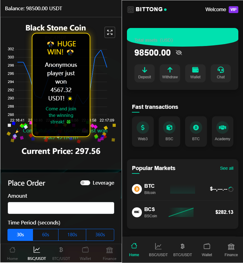 BitTong虚拟货币微交易投资理财源码/现货交易+杠杆交易+完美K线控制+完整用户输赢控制+代理/前端html+后端PHP