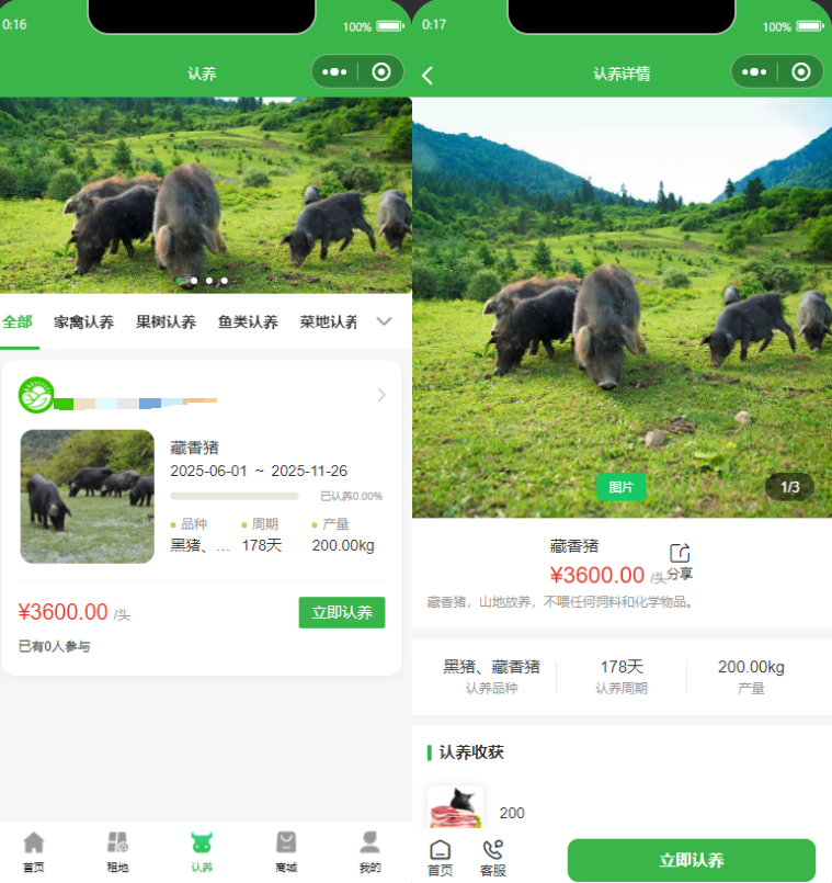 认养管理:认养分类 认养管理 养殖管理 众筹活动 轮播图管理 认养设置
