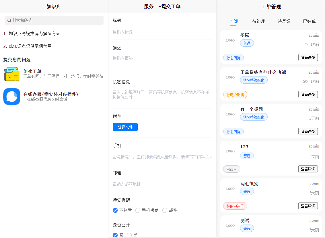 精细化管理:可定义工单紧急程度、超时自动关闭、定时催办,还能沉淀不同产品 / 服务的知识库(支持外部引入)。