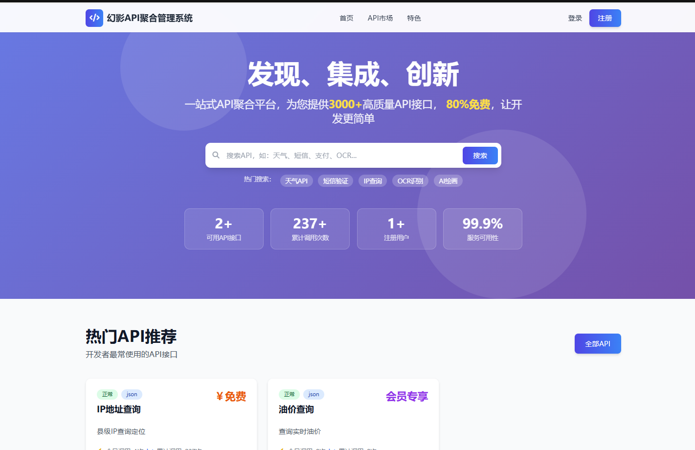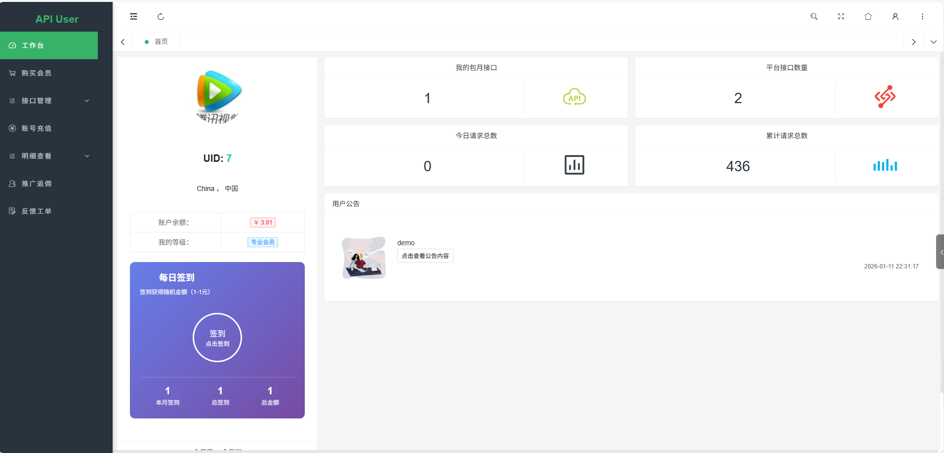 系统内置完善的用户管理系统,支持用户注册、登录、API密钥管理、余额充值、套餐购买等功能。用户可以查看自己的调用记录、消费明细和账户余额。系统自动统计每个API的调用次数、成功率和响应时间,为管理员提供数据支持。