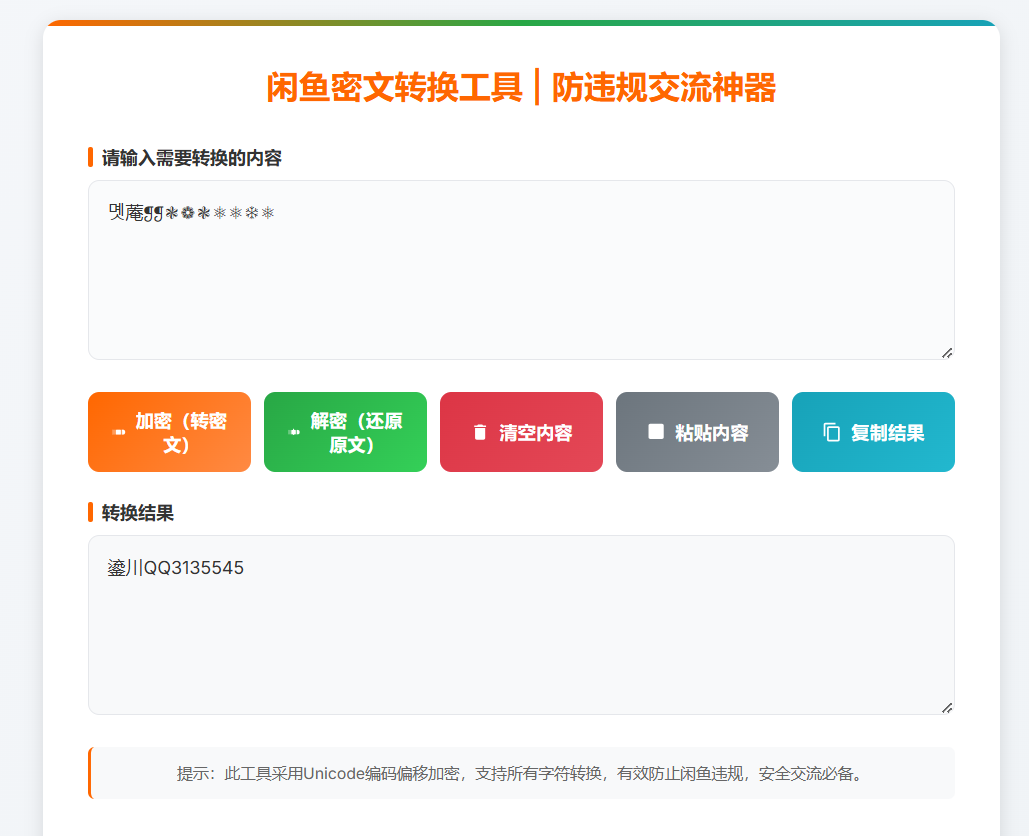 这个工具是为闲鱼用户量身打造的防违规交流神器,核心作用就是把容易触发平台检测的敏感内容,转换成平台识别不出的密文,从而实现安全沟通。
